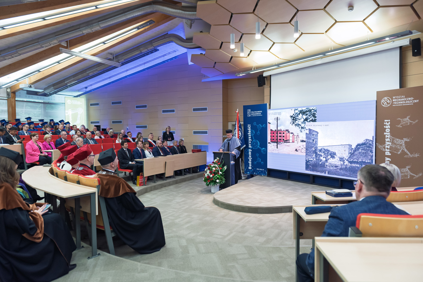 „Politechnika Rzeszowska to jedna z czołowych uczelni technicznych w Polsce. Odgrywa znaczącą rolę w rozwoju edukacji technicznej i naukowej w regionie Podkarpacia. Jej obecność w Stalowej Woli, trwająca już 60 lat, to okres dynamicznego rozwoju, wielu innowacji i przede wszystkim znakomitej współpracy z władzami miasta, powiatu i lokalnym przemysłem” – powiedział rektor prof. Piotr Koszelnik, rozpoczynając uroczyste posiedzenie Senatu Politechniki Rzeszowskiej.