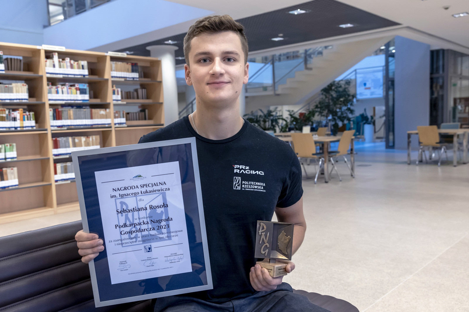 Student mechaniki i budowy maszyn Wydziału Budowy Maszyn i Lotnictwa, lider zespołu PRz Racing Sebastian Rosół otrzymał nagrodę specjalną w konkursie Podkarpacka Nagroda Gospodarcza 2023 za zaangażowanie w prace badawczo-rozwojowe i nieprzeciętne osiągnięcia w tym obszarze.
