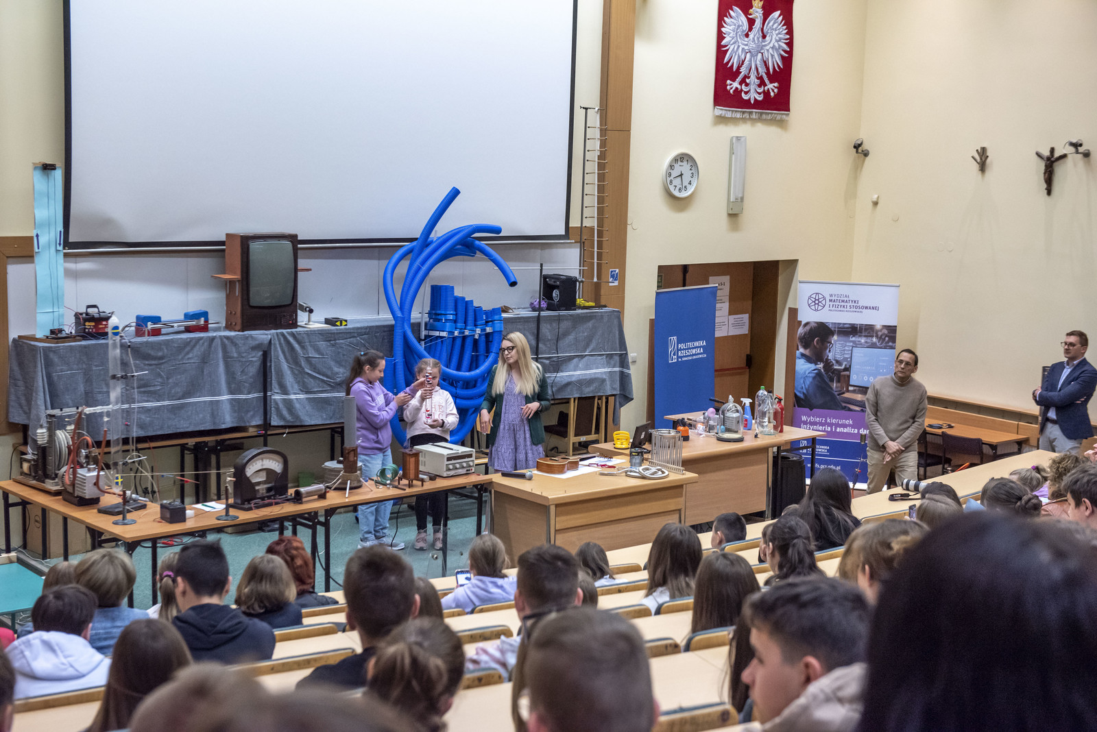 Atrakcyjne demonstracje wybranych praw i zjawisk fizycznych realizowane przez pracowników Politechniki Rzeszowskiej pozwoliły przybliżyć młodym ludziom – uczniom szkół podstawowych, gimnazjów czy też liceów te obszary wiedzy, z których zrozumieniem na co dzień mają na ogół duże problemy.